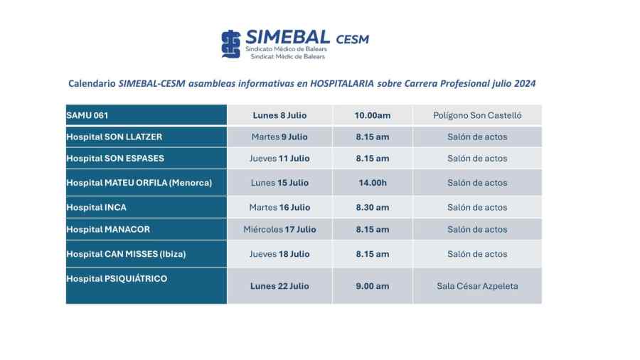 Hoy, SIMEBAL-CESM ha dado comienzo a la programada ronda de asambleas informativas, abiertas al público, sobre la Carrera Profesional, con las que el Sindicato Médico de Balears va a recorrer todos los hospitales de las islas. En estas reuniones, se explicará en detalle el acuerdo firmado el pasado 2 de julio con el Govern, que reactivará la Carrera Profesional, bloqueada desde 2017.